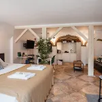 TV, área de jantar e área de estar são fornecidos nos quartos do apartamento. Casa de banho tem chuveiro, secador de cabelo e toalhas.